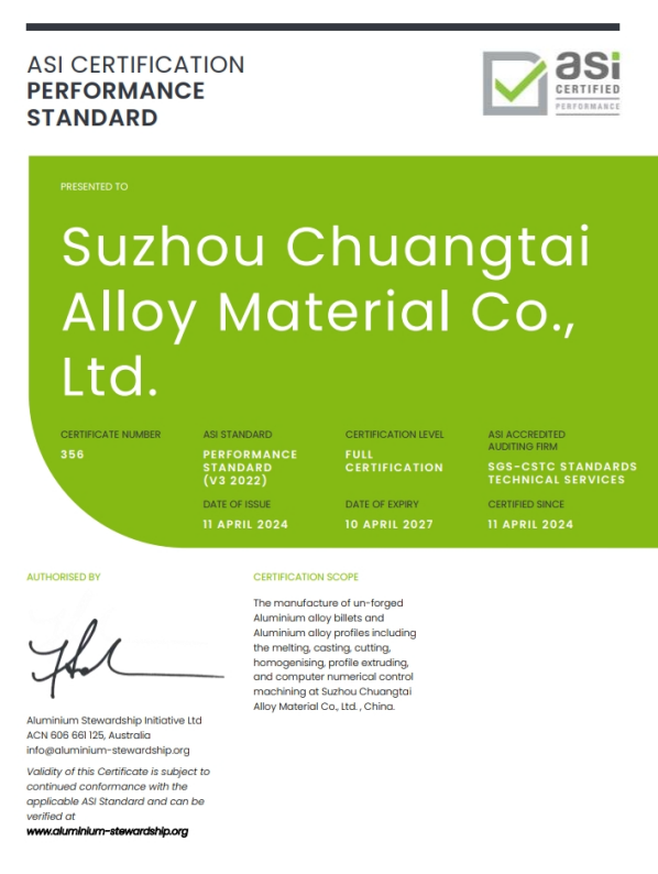 5月17日,铝业管理倡议(ASI)宣布,Z6尊龙新材料科技股份有限公司子公司苏州创泰合金材料有限公司获得 ASI 绩效标准 V3(2022)认证。